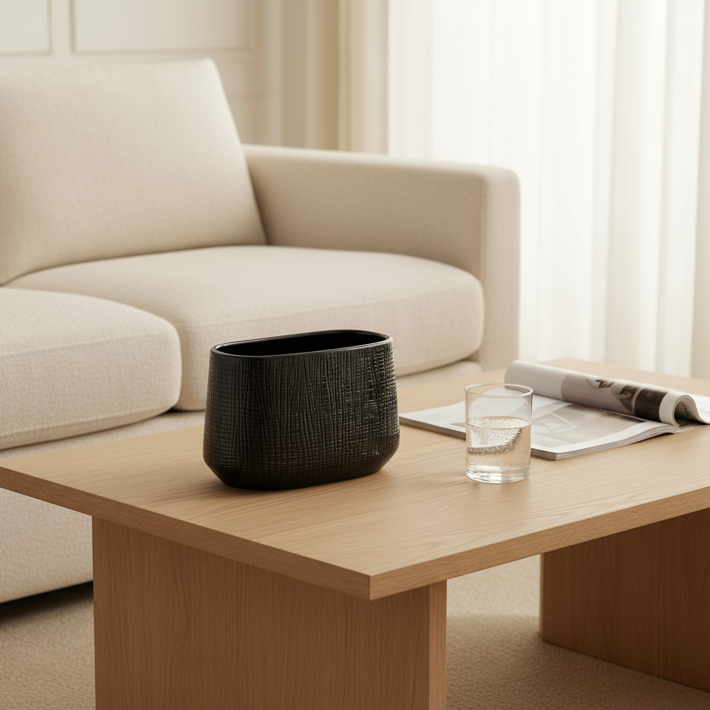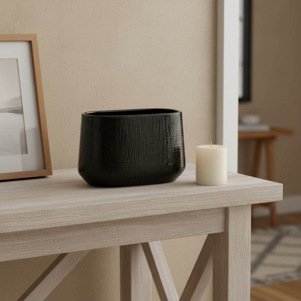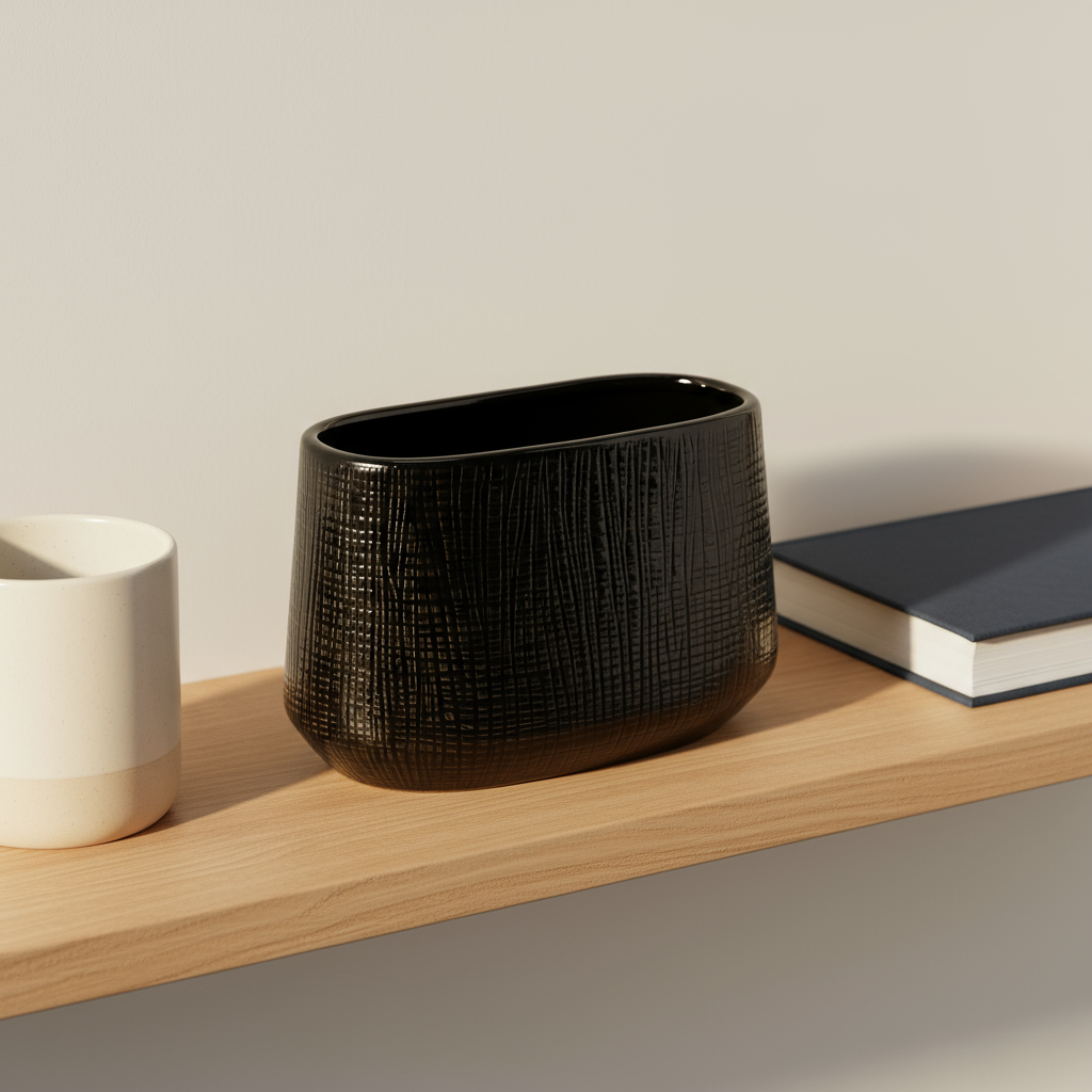 The Noora Vase embodies quiet sophistication, where light and shadow play across its deep, glossy surface. Its textured finish catches soft daylight in subtle ways, giving the impression of woven patterns or rippling reflections. Like a glowing lantern at dusk, it adds depth and intrigue to any room, balancing coziness with a touch of modern elegance.