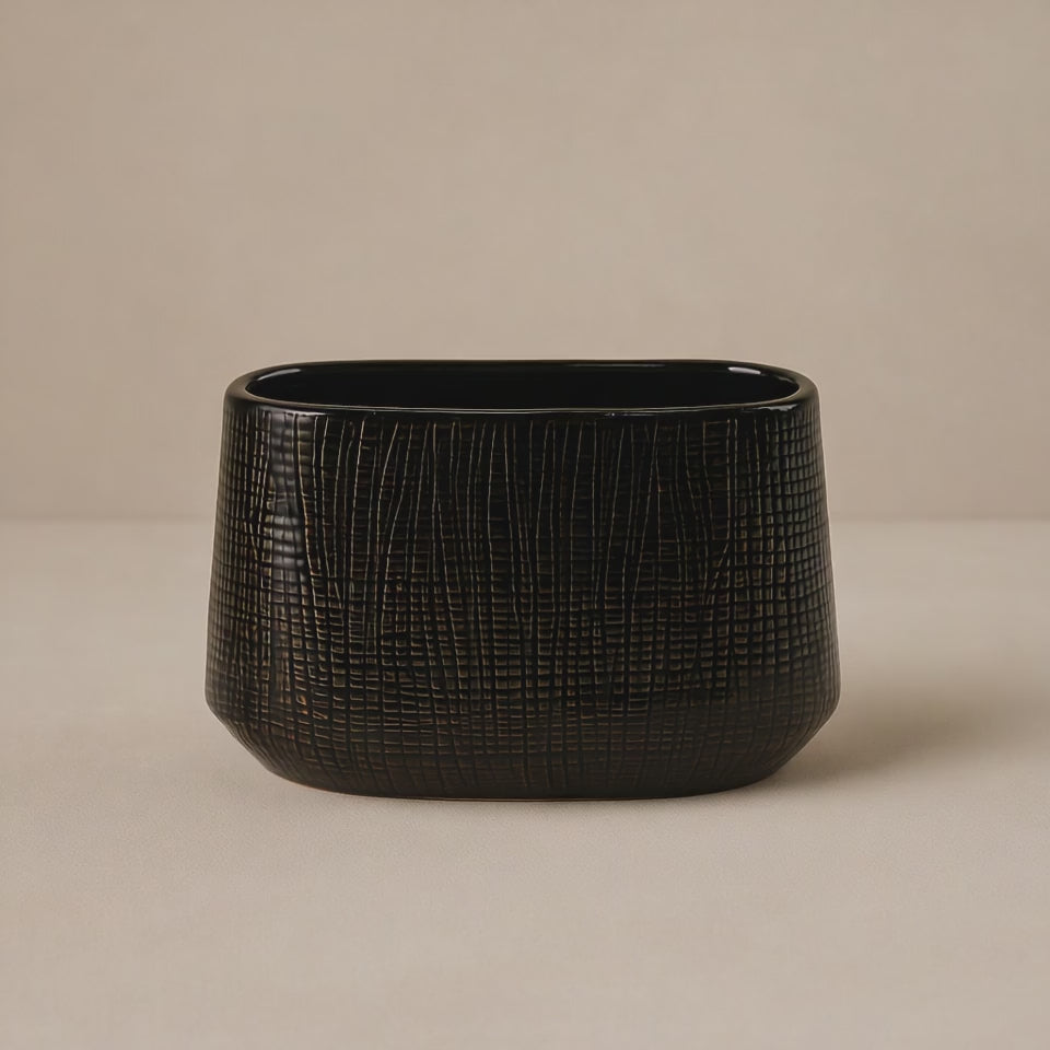 At 7" high, 9" long, and 4" wide, Noora is a versatile accent piece, equally suited for a coffee table, shelf styling, or as part of a layered centerpiece. Its bold dark glaze pairs beautifully with fresh greenery, simple white blooms, or even left empty as a sculptural statement. Compact yet impactful, Noora fits seamlessly into a hygge-inspired home, grounding the space with a balance of contrast, comfort, and atmosphere.
