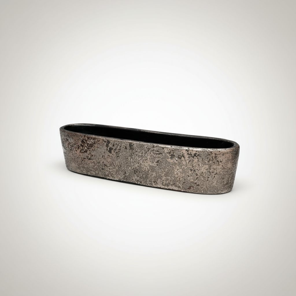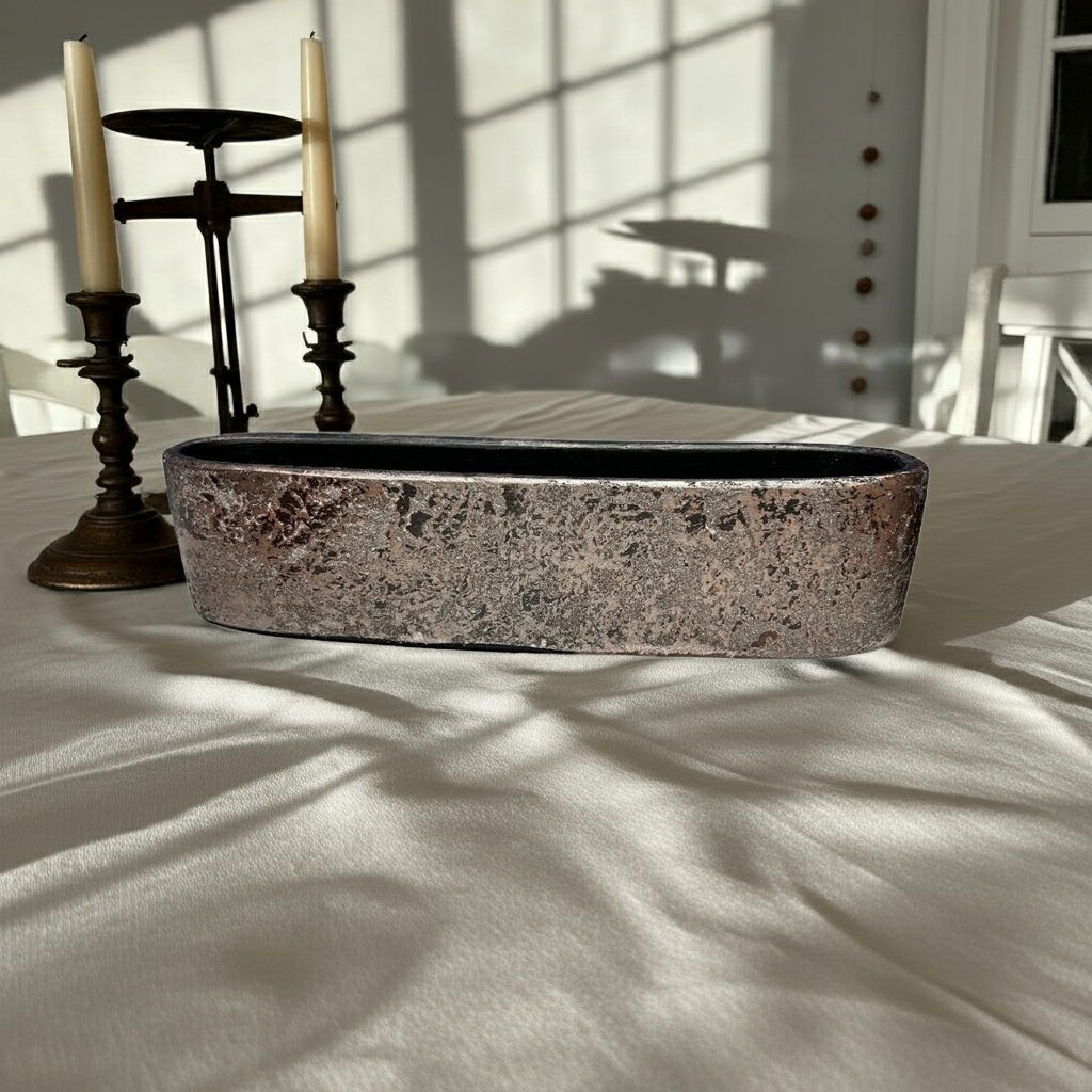 Hand-finished ceramic with a softly weathered surface in pink, its slim oval form is perfect for a simple line of stems, tea lights, or a minimalist moss arrangement. A relaxed, lived-in accent that makes everyday tables feel thoughtfully dressed.