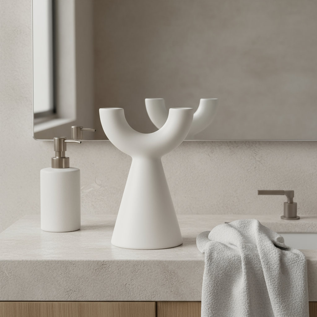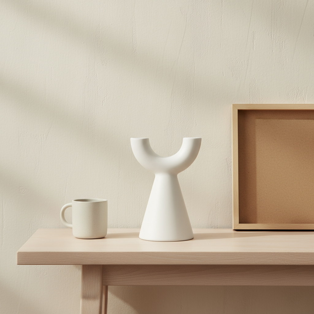 The Yoke Totem Vase is a small-but-striking accent with a sculptural, yoke-shaped mouth perched on a tapered cone base. Its soft matte ceramic finish and gentle hand-worn curvature give it a modern, artisanal feel that reads like a little piece of sculpture even when empty.