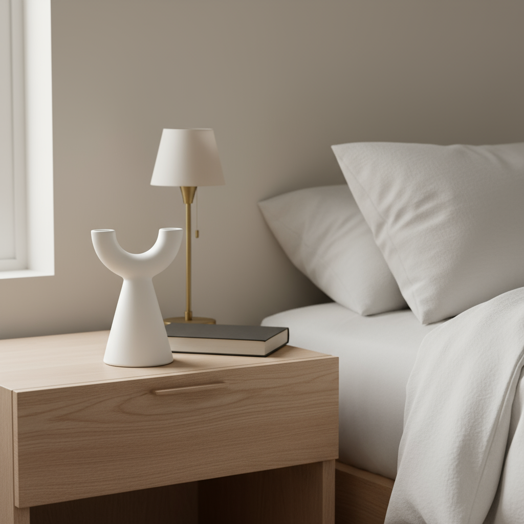 Sized at 6"H × 4"W × 3"L, it’s perfect for tight vignettes - nightstands, shelves, or trays - while the open crescent lip cradles a few delicate stems without crowding. Offered in Black and White, the Yoke Totem layers seamlessly into Scandinavian, minimalist, and Japandi spaces.